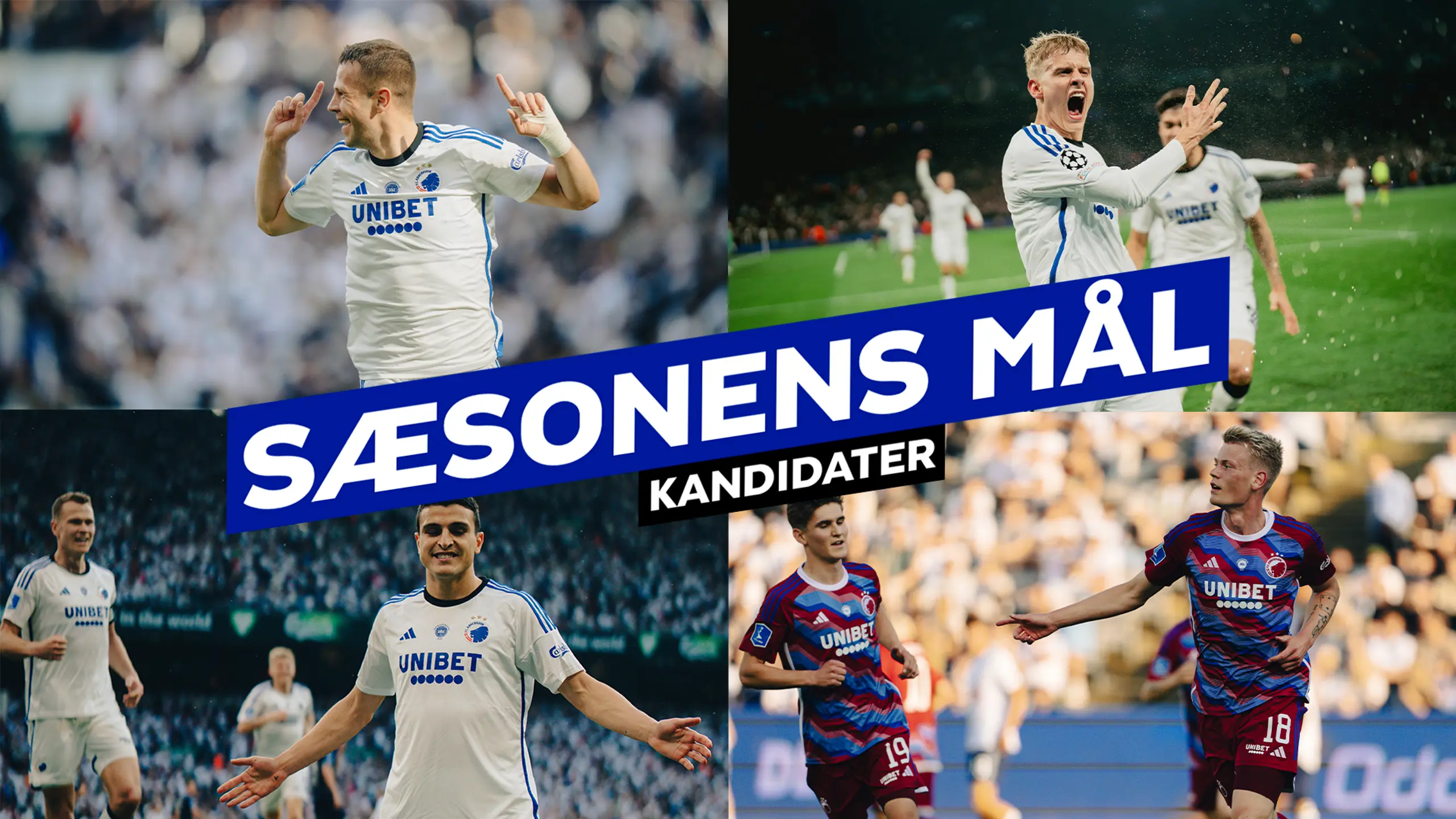 Hvem scorede Sæsonens Mål i sæson 23/24? Hele 98 FCK-mål blev scoret på tværs af alle turneringer, og iblandt dem er der blevet udvalgt 13 flotte mål.