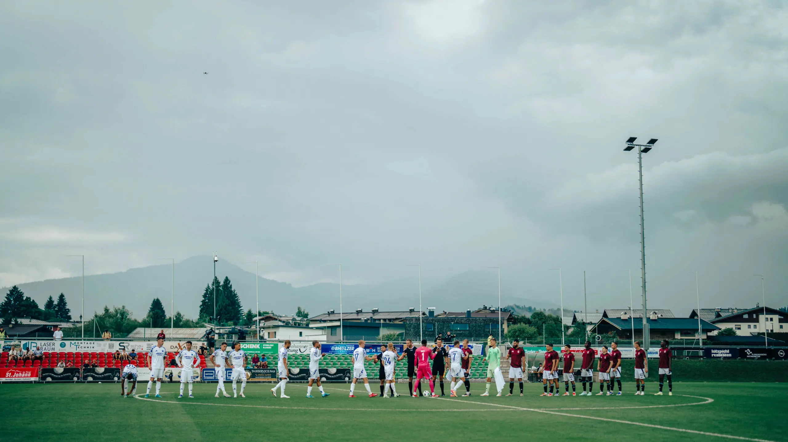 Tanken om torden strejfede os allerede halvanden time før kickoff, da vi havde kørt de ca. 15 kilometer fra hotellet i Scheffau am Wilden Kaiser og stod på Koasastadion i St. Johann og kiggede rundt på den smukke natur med alle bjergene i Tyrol.