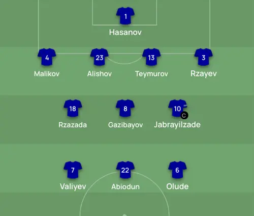 Vi ved heller ikke, om denne taktiske formation holder stik, men her har du i hvert fald Qarabag-holdet, som UEFA har sat det op. Ni spillere fra Aserbajdsjan og så to nigerianere oppe foran (Abdiodun og Olude)