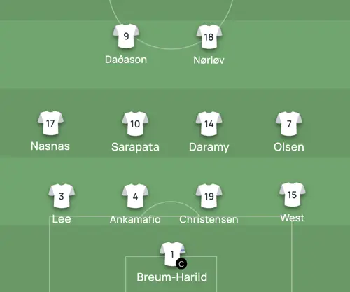 1 Tobias Breum-Harild (anf.) - 18 William Nørløv, 19 Aske Bang, 4 Graham Ankamafio, 3 Kyung-Hyun Lee - 10 Dominik Sarapata, 17 Marvin Nasnas - 15 Liam West, 7 Gunnar Olsen, 14 Abdul Daramy - 9 Viktor Dadason
