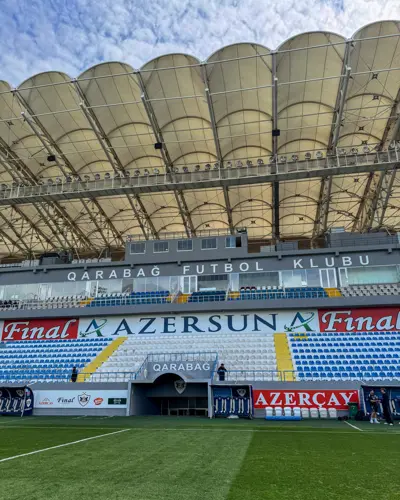 Kampen er i gang! Dommeren hedder Amine Kourgheli og er fra Belarus - og vi angriber i 1. halvleg med vinden i ryggen og solen i øjnene. En lille gruppe Qarabag-fans står bag vores mål og sætter stemningen - her er vel et halvt hundrede tilskuere i alt